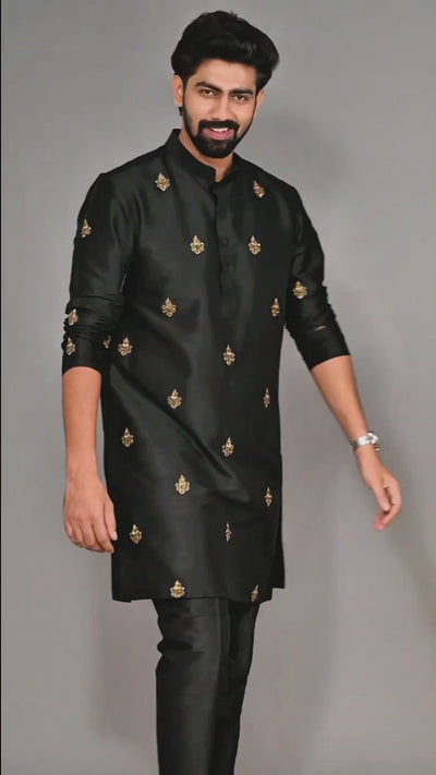 Black Silk Kurta with Golden Hand Embroidered Thread Detailing (Kurta Only)
