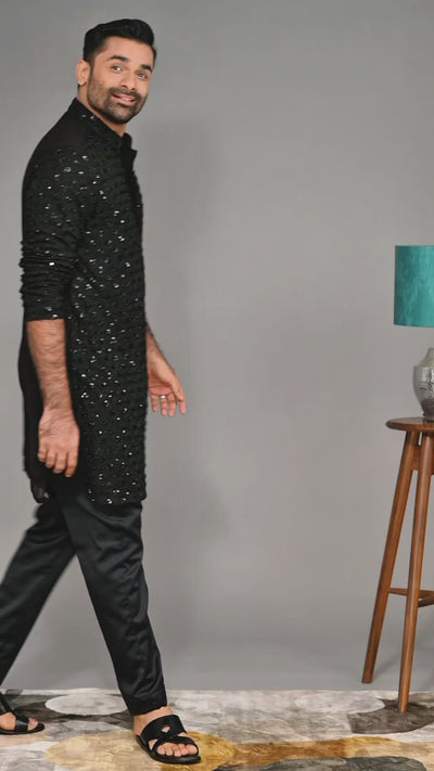 Designer Black Kurta with Glossy Self Surface Embroidery paired with Narrow Pants