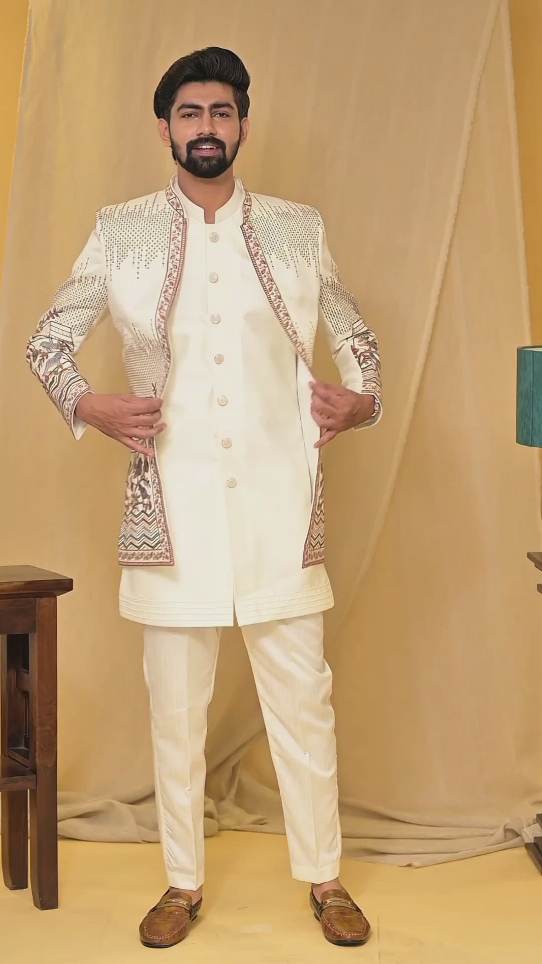 Embroidered Ivory Shade Open Indo Western Slim Jacket