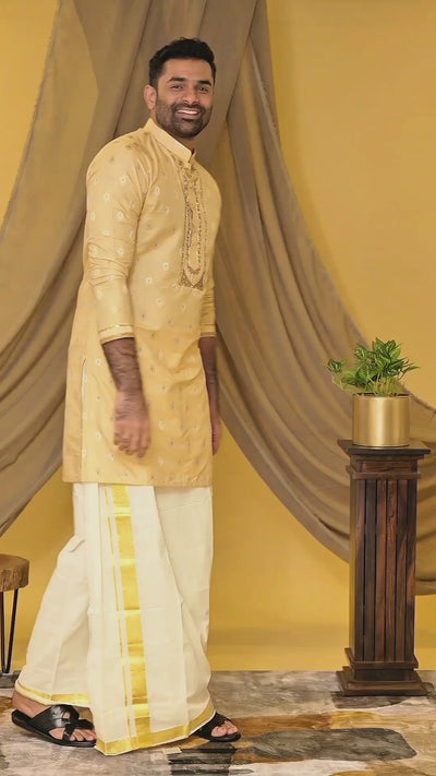 Golden Silk Brocade Kurta with Heavy Golden Handwork detailing on wide placket border & sleeve edge (Kurta Only)