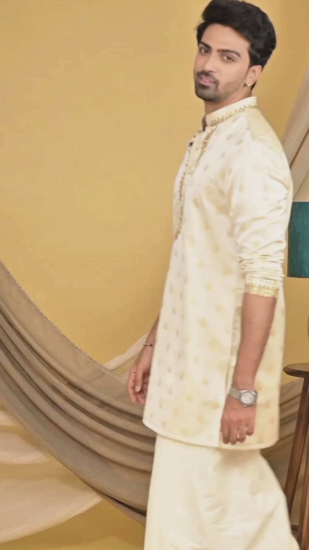 Light Golden Heavy Brocade Silk Kurta with Hand Embroidery Detailing