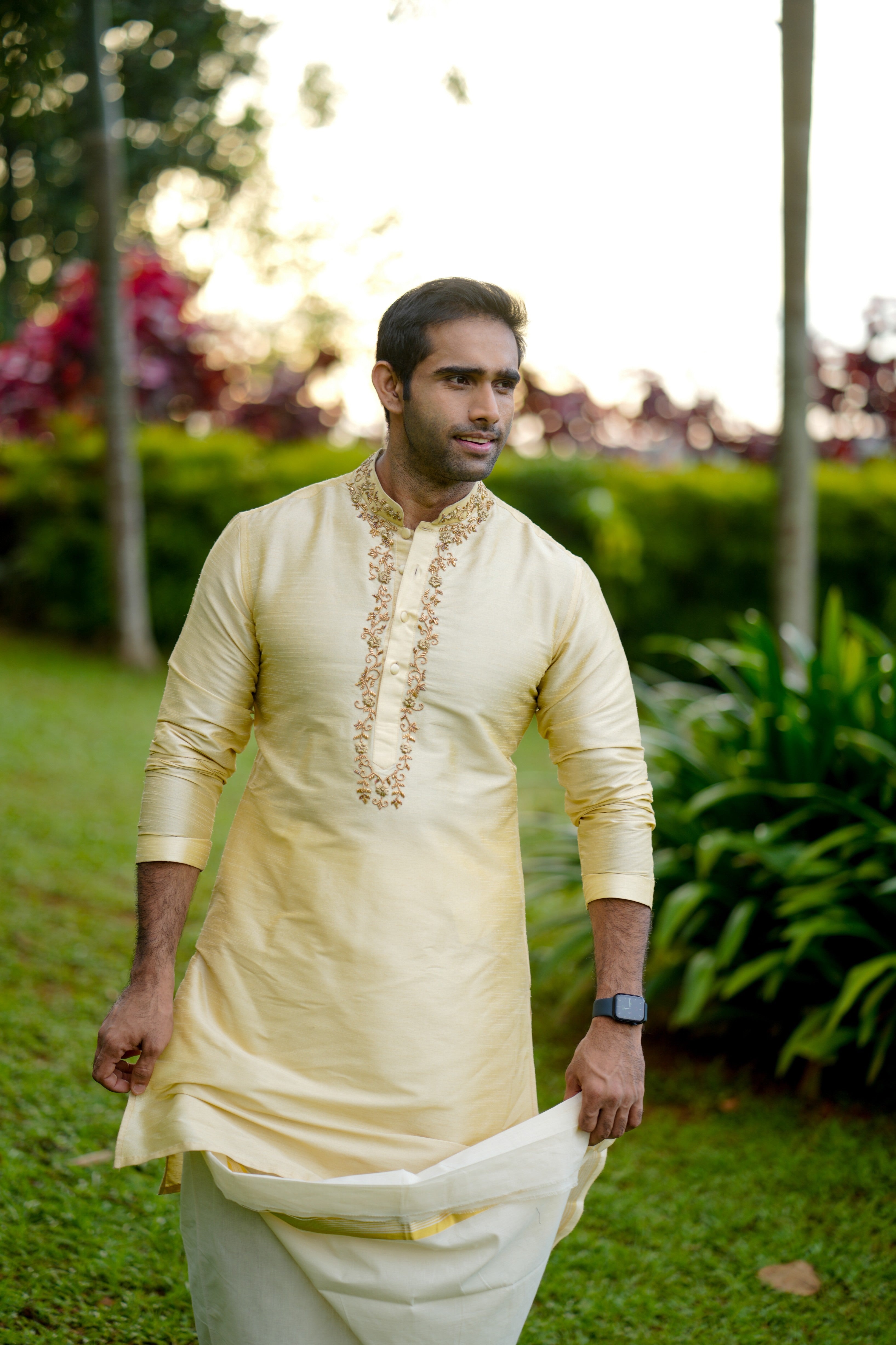 Light Golden Kurta Set with Hand Work Detailing on Placket & Neck (Kurta + Kasavu Munde)
