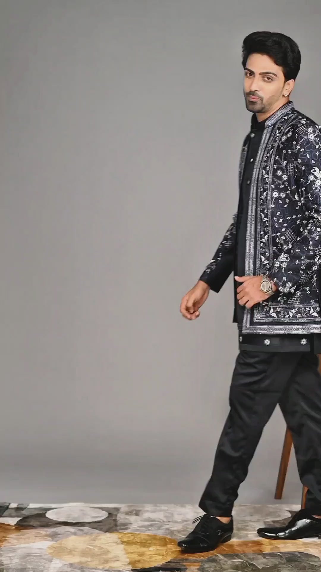 Midnight Blue Open Indo Western Slim Jacket paired with Kurta & Narrow Pants (Set of 3)