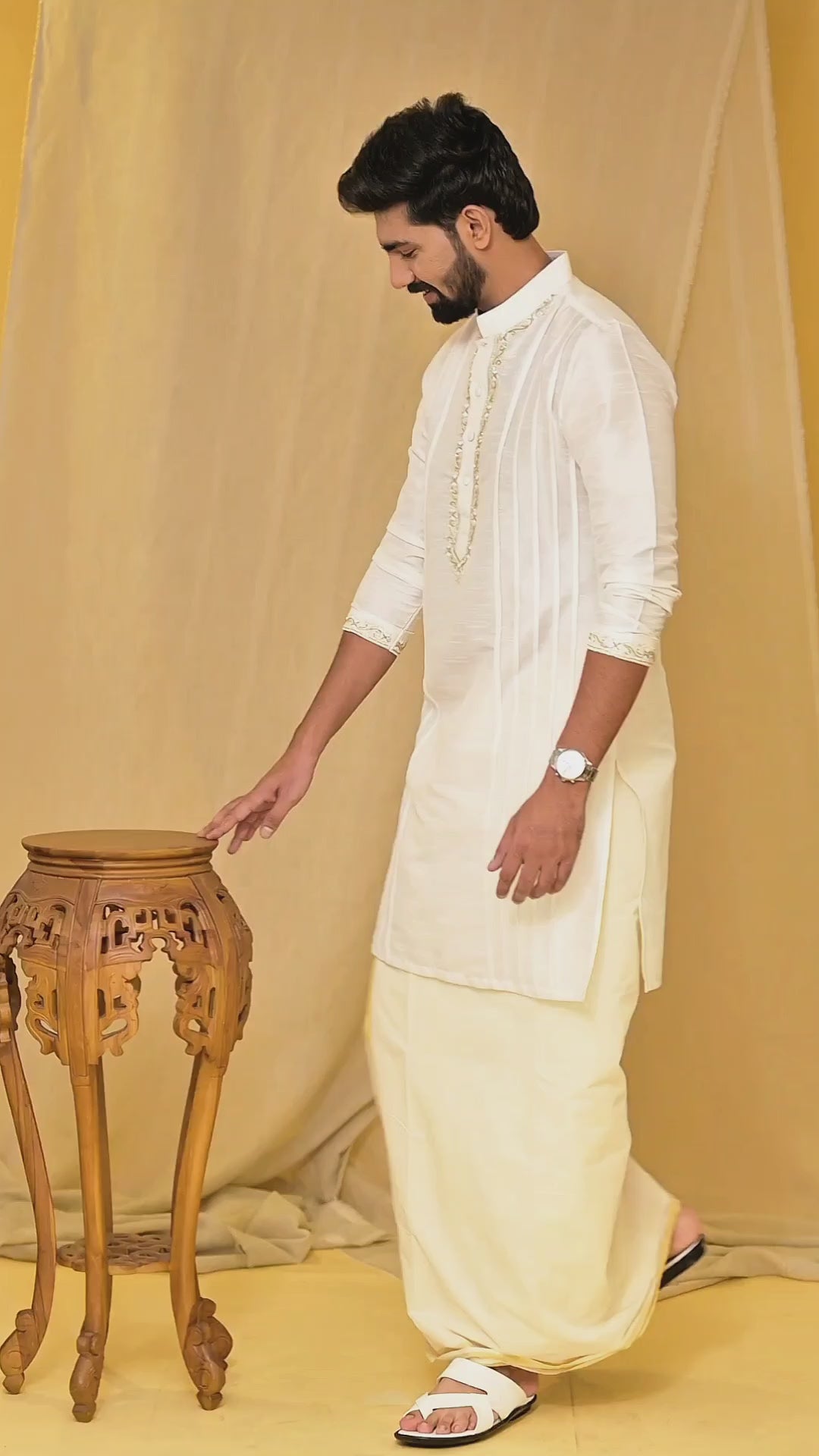 Off- White Silk Kurta with Hand Embroidery detailing on placket, neck border & sleeve edge (Kurta Only)